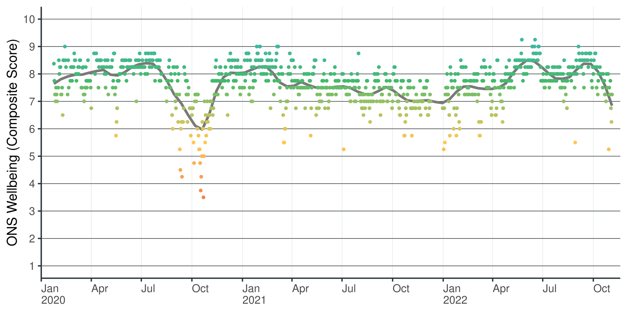 The ONS is a more nuanced measure than my ten-point subjective wellbeing scale. However, for simplicity I add the four ONS scores together (reverse scoring Q4 because it's negative) to create a single composite index. The composite score over time is plotted below.