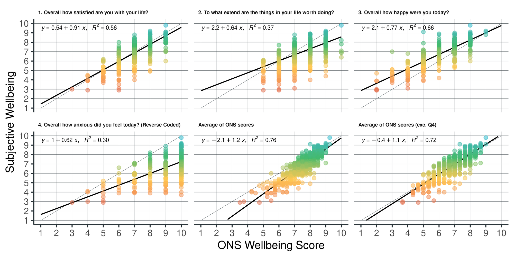 Some of the ONS questions are more correlated with my subjective wellbeing than others. This seems to be because ONS Q1 and Q2 address whether my life is 'objectively' good. Even when I felt subjectively bad I recognised that my life was objectively very fortunate, which led to a divergence between the ONS and my subjective rating. We see that ONS Q3 and Q4, which are more subjective, align more closely with my subjective wellbeing scores.