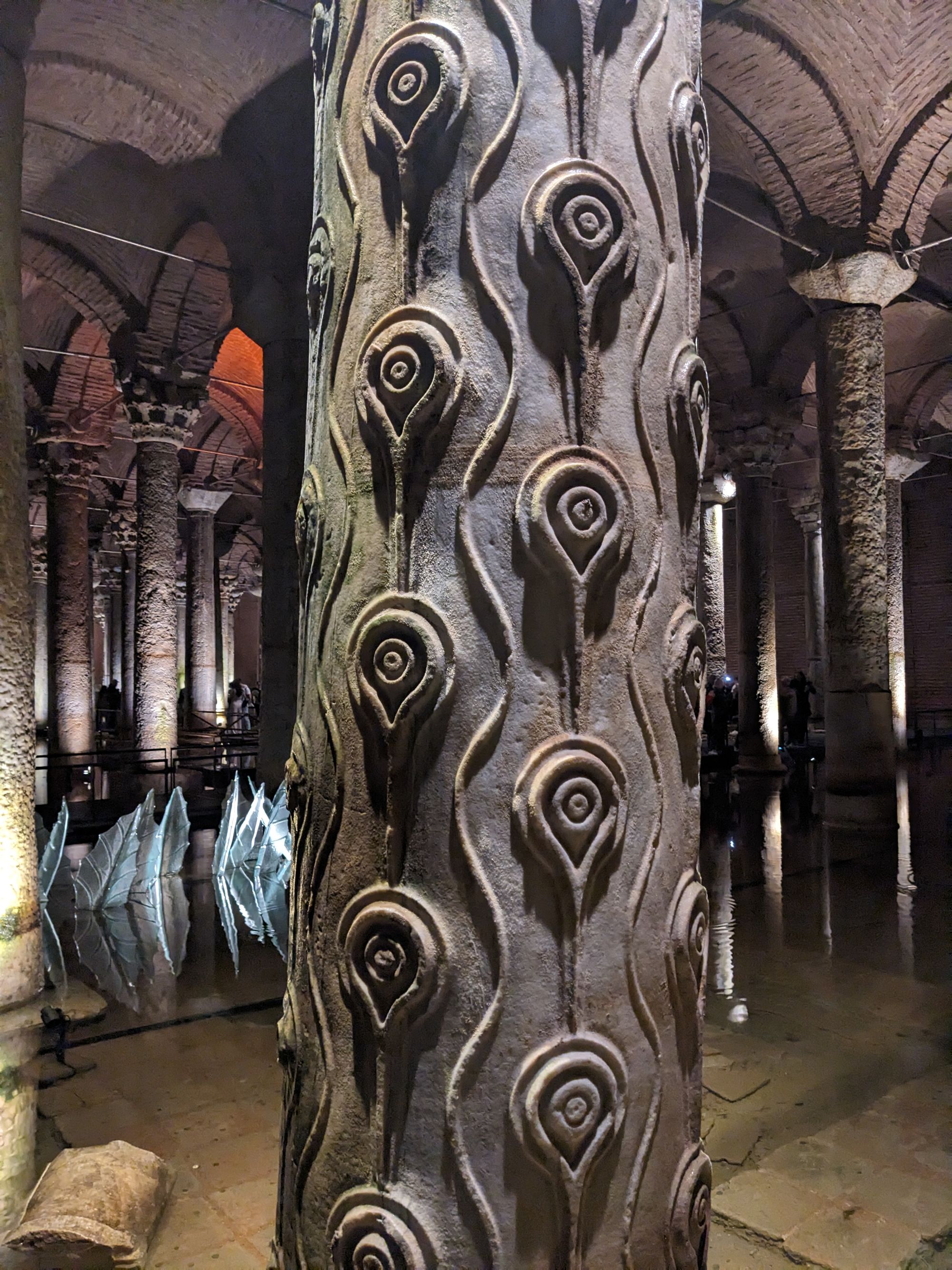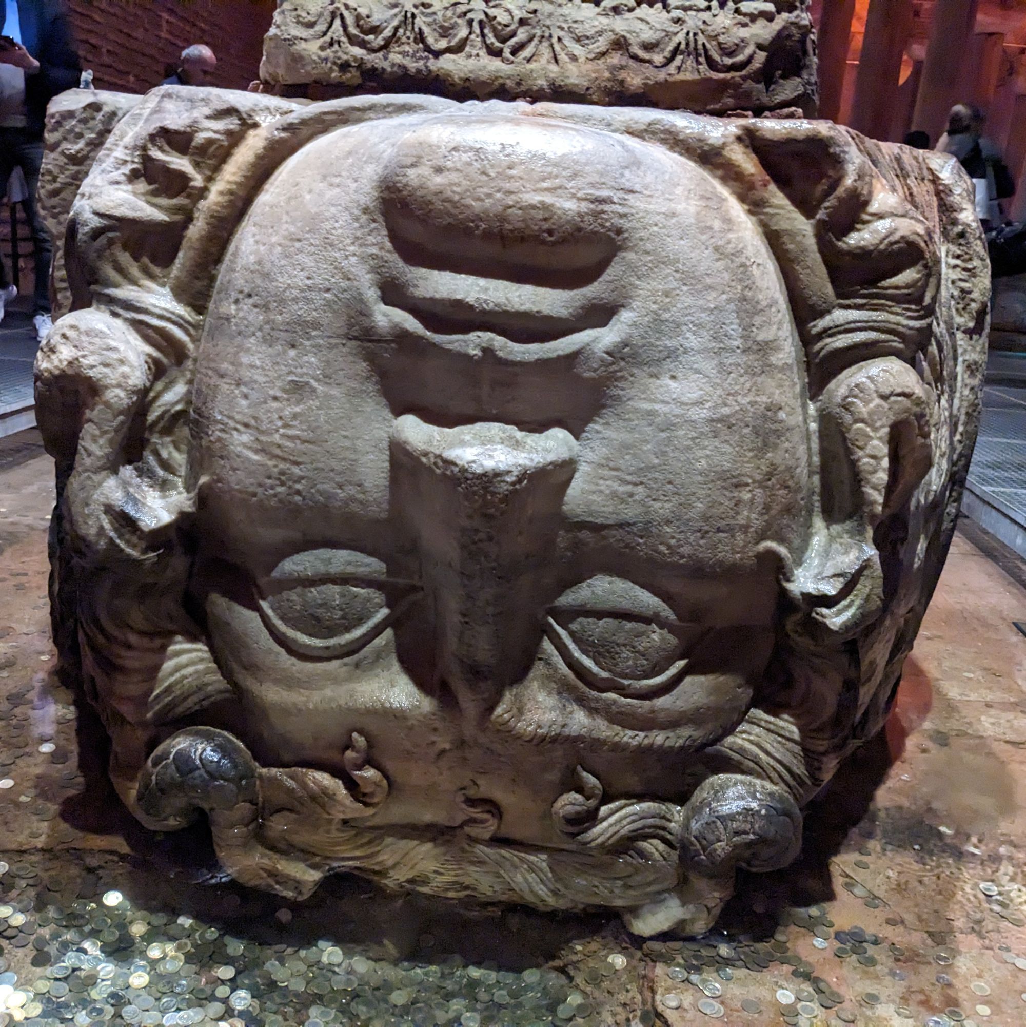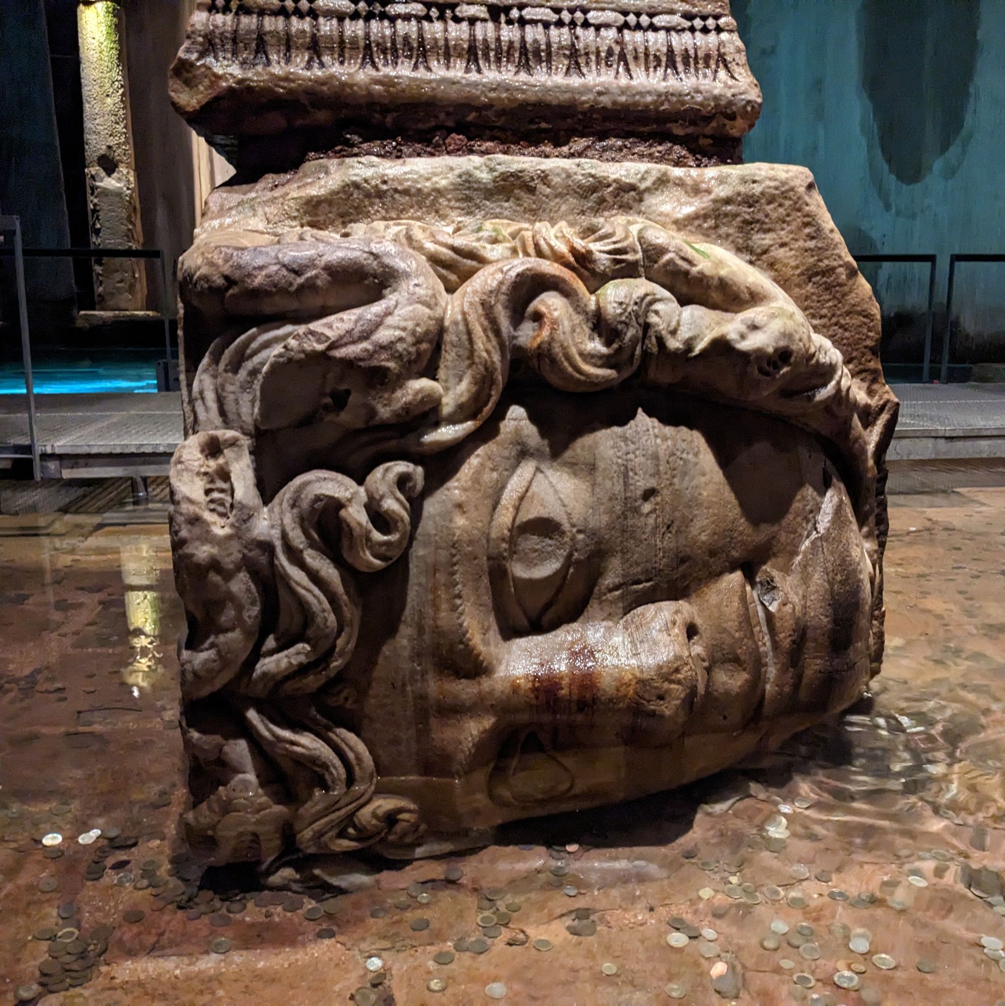 In the northwest of the Cistern in particular there are two columns with the face of Medusa in their base. These may be repurposed columns from elsewhere in the city - it's not clear. The heads are said to be rotated sideways to nullify the Gorgons' ability to turn one into stone.