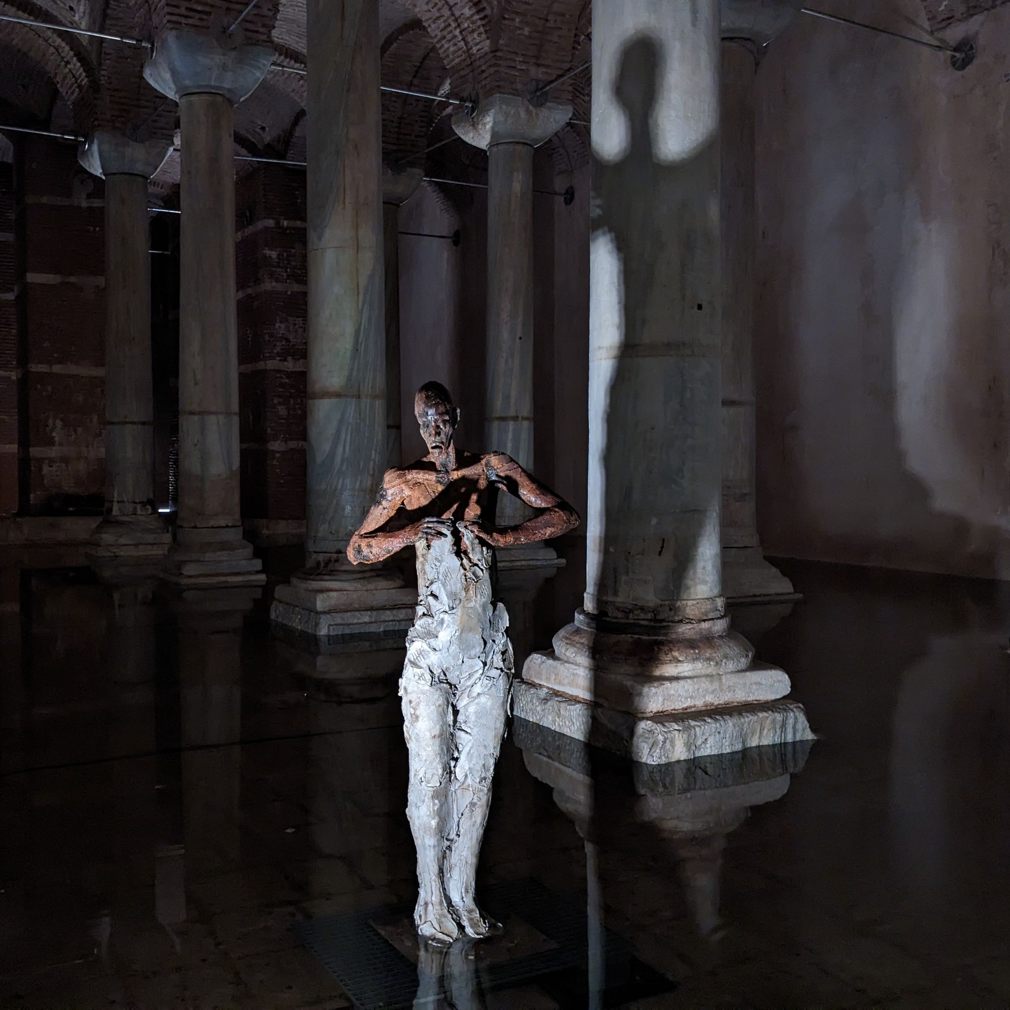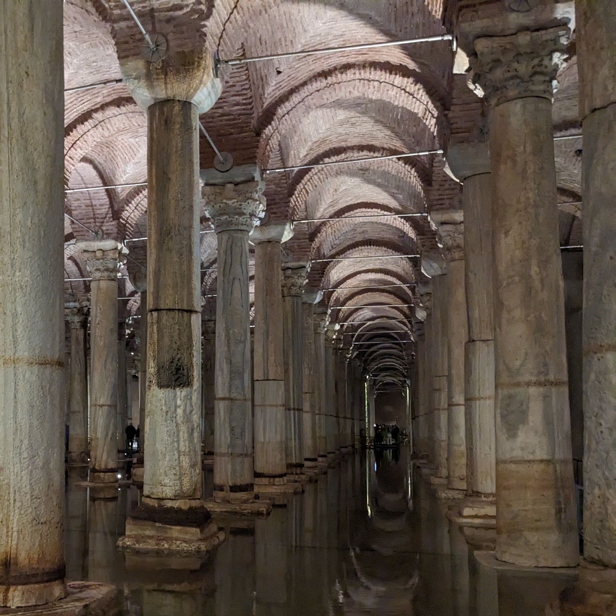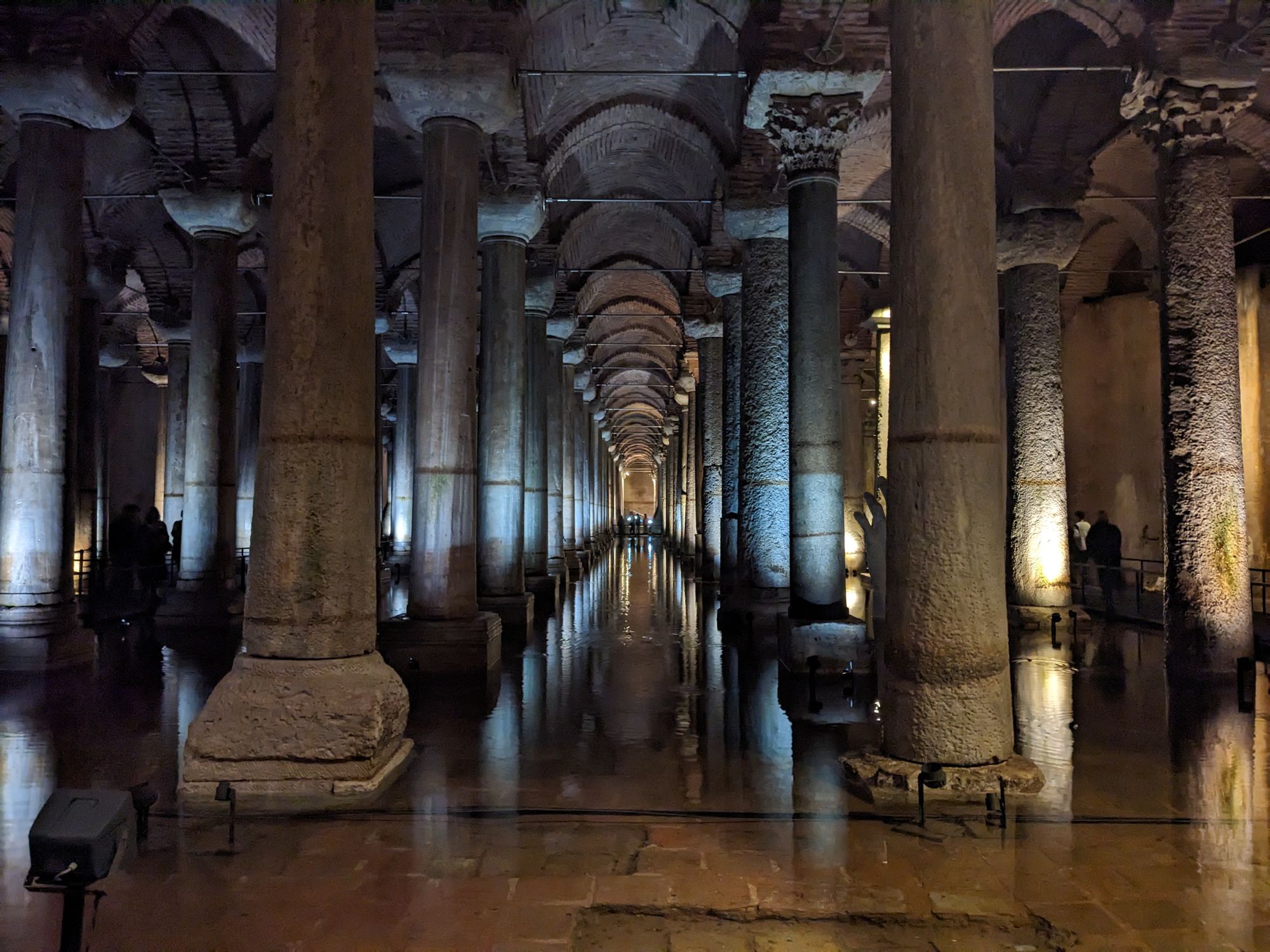 In the northwest of the Cistern in particular there are two columns with the face of Medusa in their base. These may be repurposed columns from elsewhere in the city - it's not clear. The heads are said to be rotated sideways to nullify the Gorgons' ability to turn one into stone.