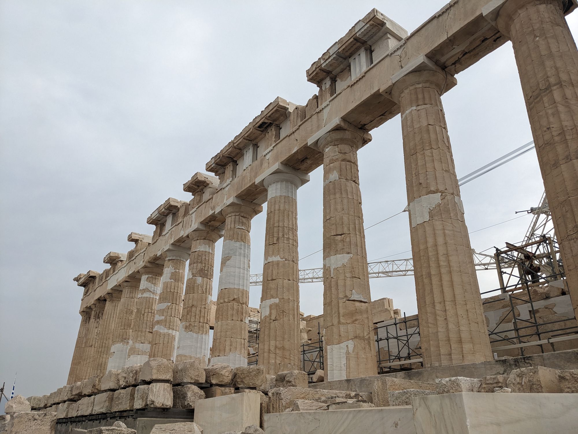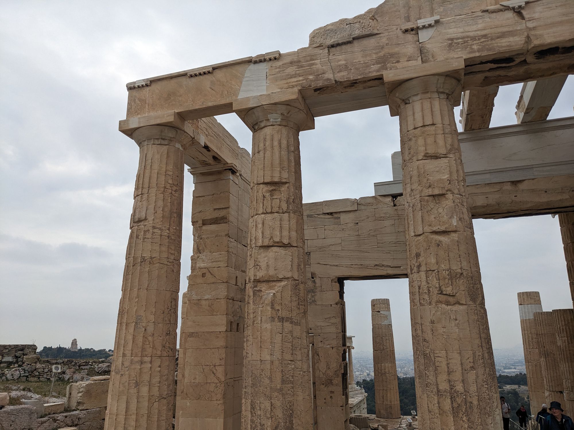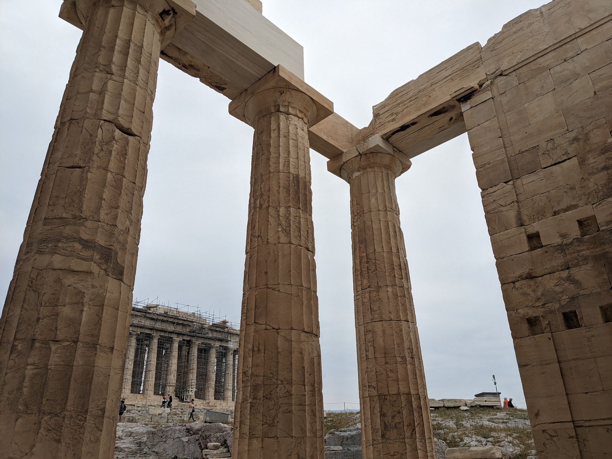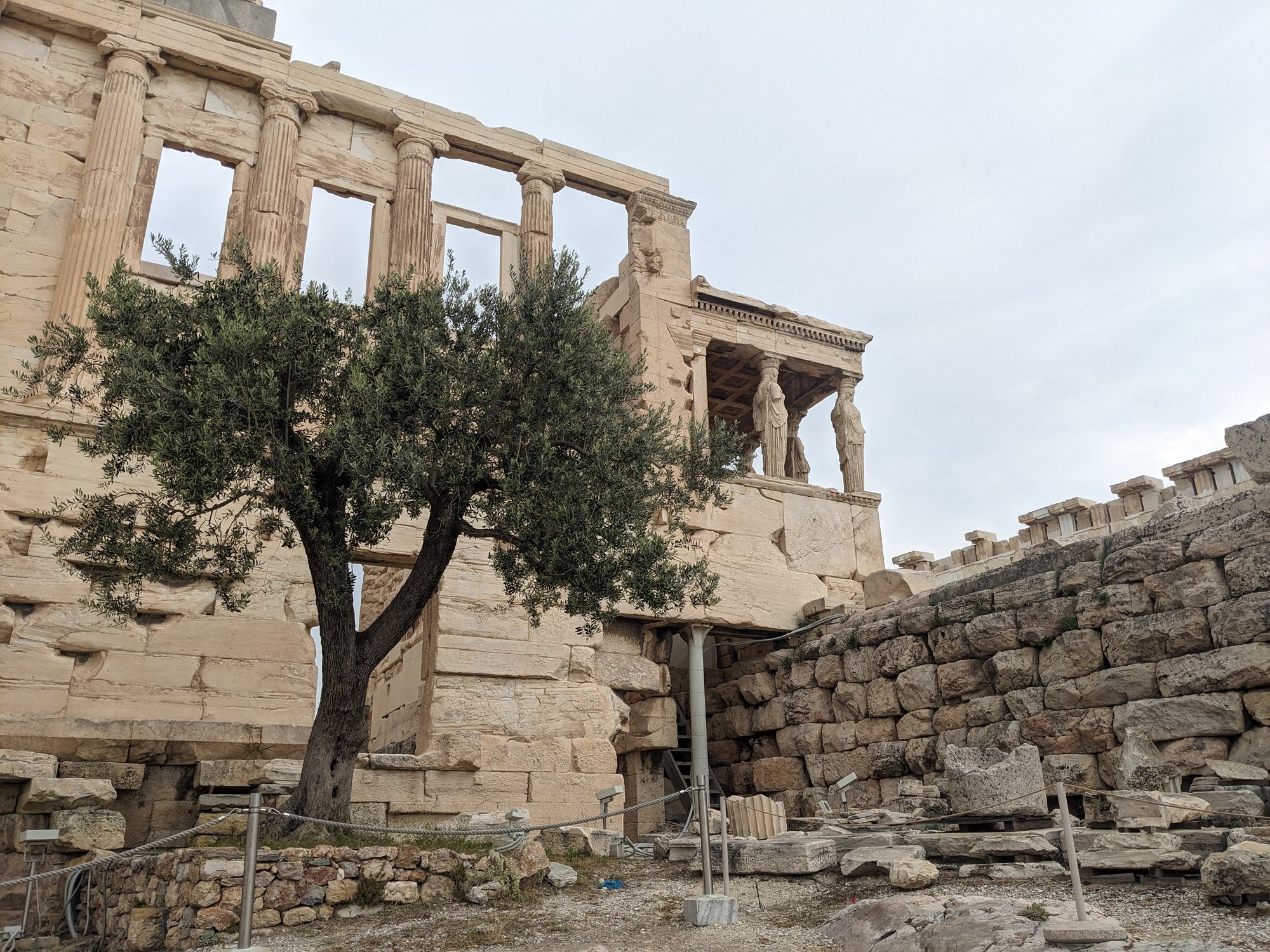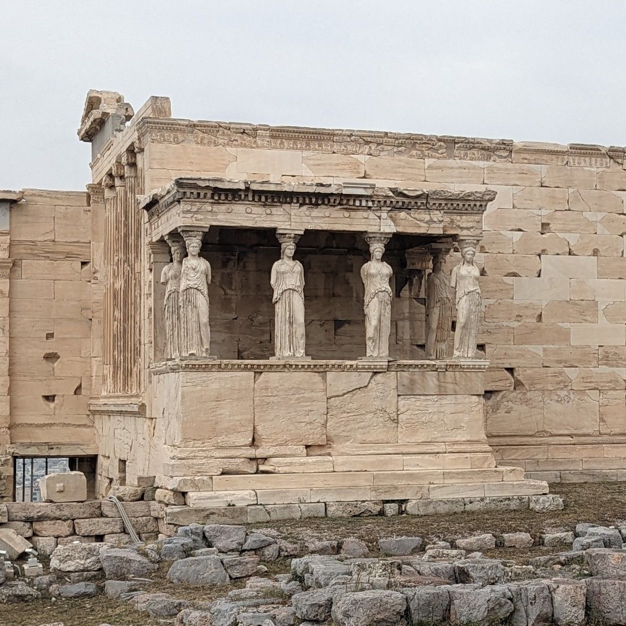 Past the entrance lies the Erechtheion, a temple dedicated to Athena and Poseidon. It is famous for its Caryatids - six sculpted female figures that support the roof. If the figures were male, they'd be called telamones or atlantes.