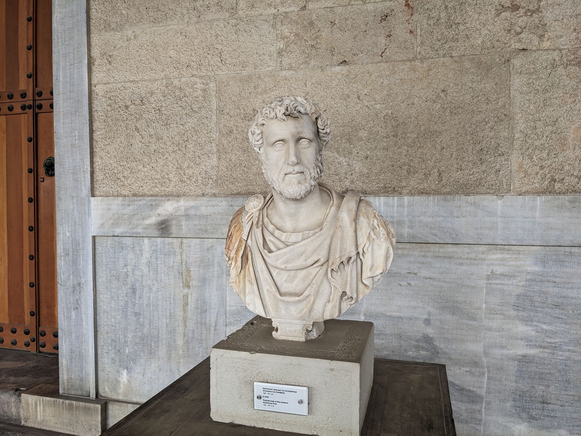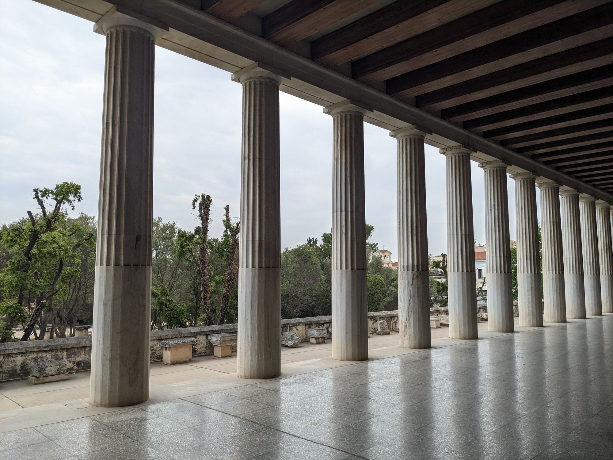 Also within the Agora is the Stoa of Attalos, a large covered walkway that was built in the 2nd century BCE as a marketplace and gathering place for citizens. The stoa was restored in the 1950s and now houses a museum of ancient artifacts. My guide reported that the statues here are missing their heads because the Roman Emperor Hadrian, who was usually such a Hellenophile, decapitated the statues as a strike against Hellenic polytheism.
