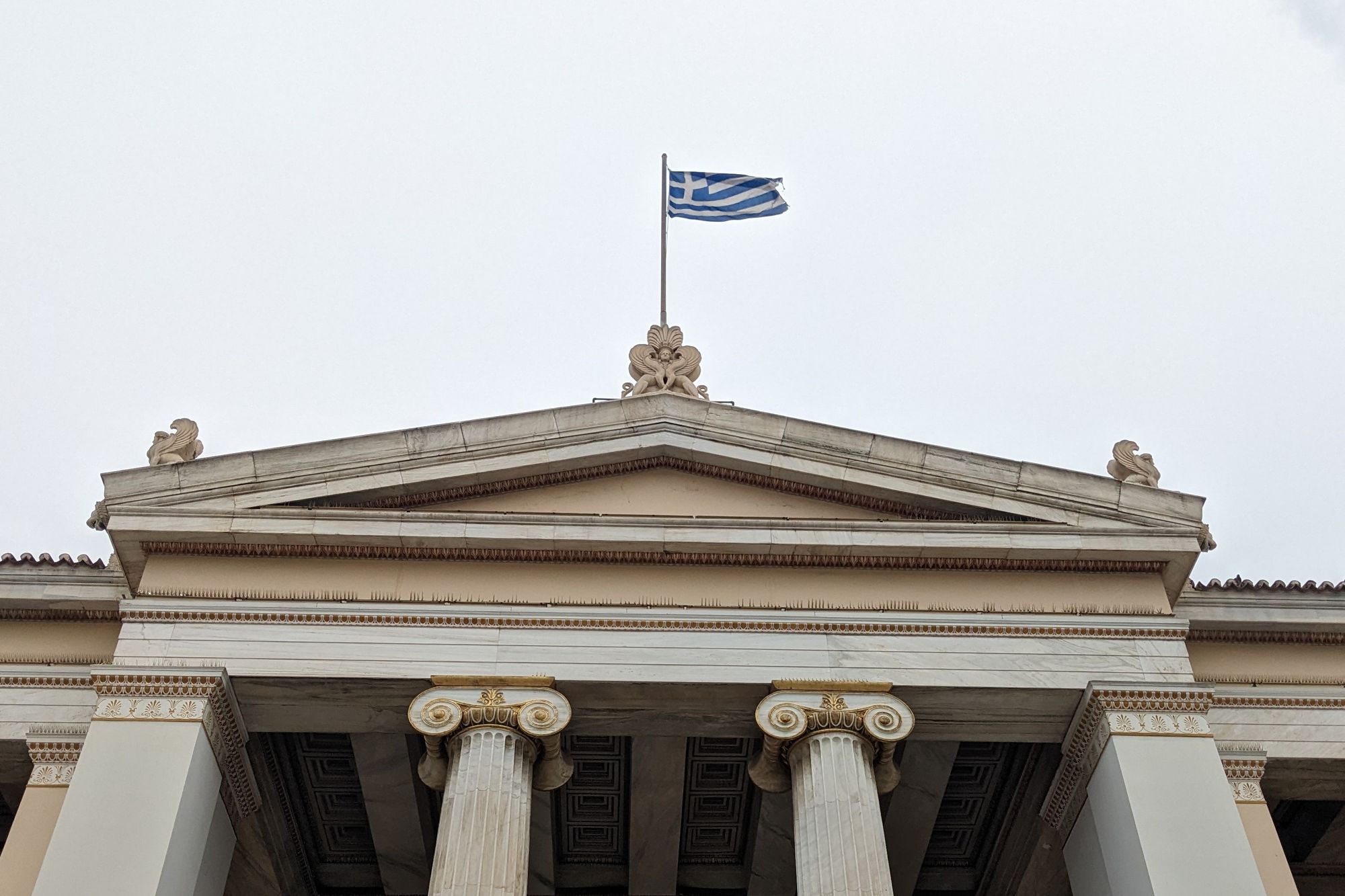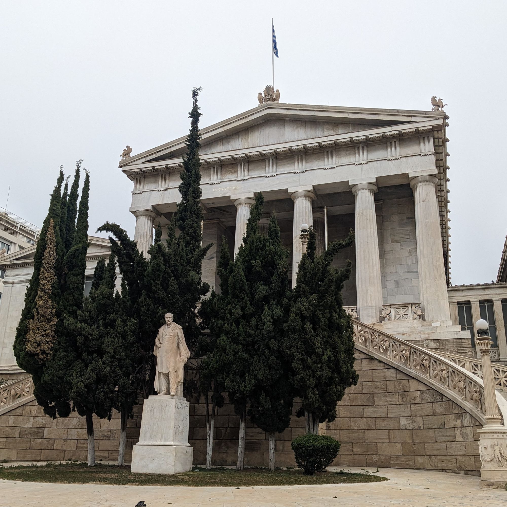 I headed up the road towards the Academy of Athens. Police had setup cordons around the street and were watching everything along the route. The Academy was closed, but many tourists, such as myself, had gathered to photograph its classical exterior without students entering the shot.