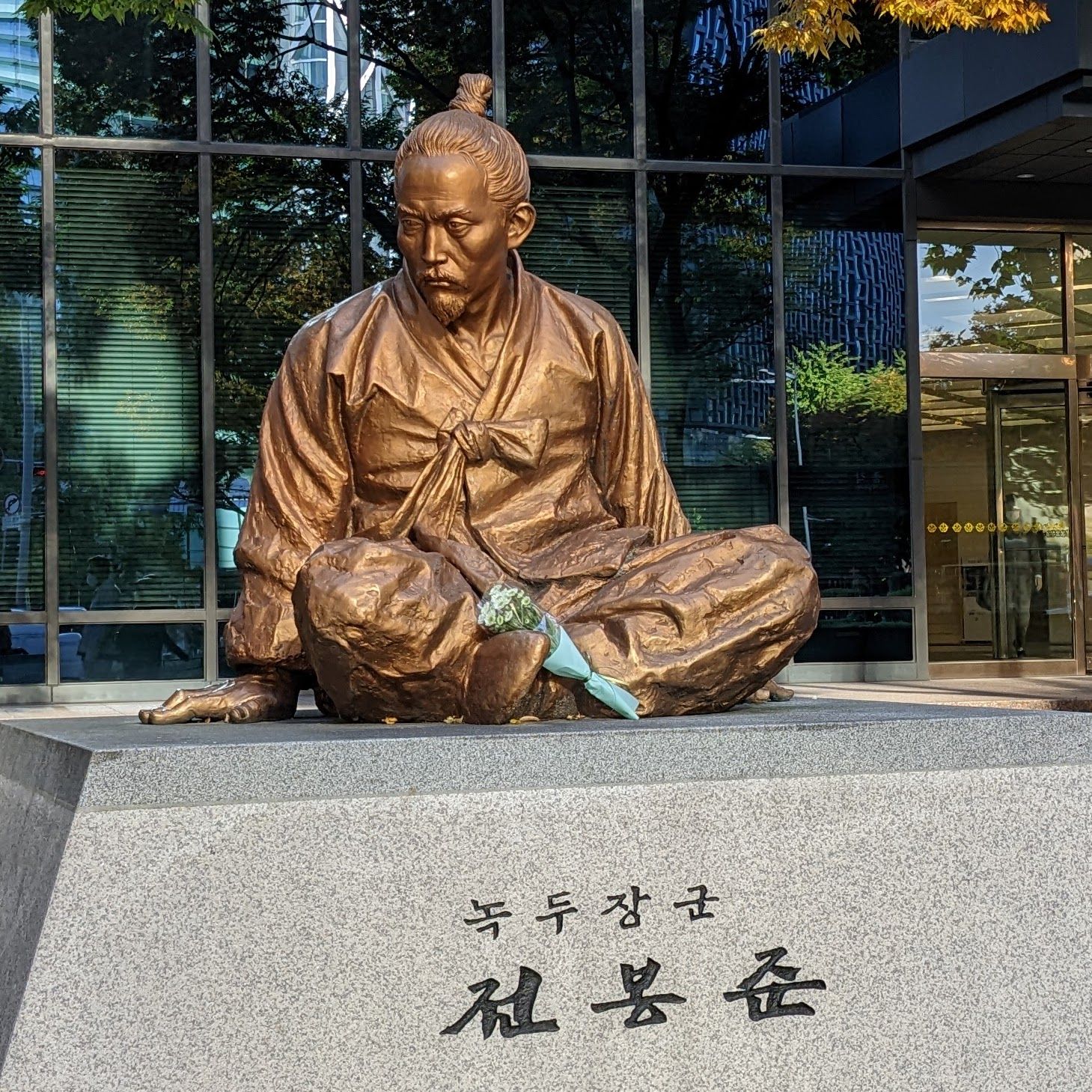 We then crossed the Cheonggyecheon, a reclaimed urban waterway and passed a statue of Jeon Bong-jun, the leader of the Donghak Peasant Uprising in 1894. Notice he tied his knot like a clock at 03:35, I think that's traditional because that's how many people on the street did theirs and it's a character detail in Train to Busan.