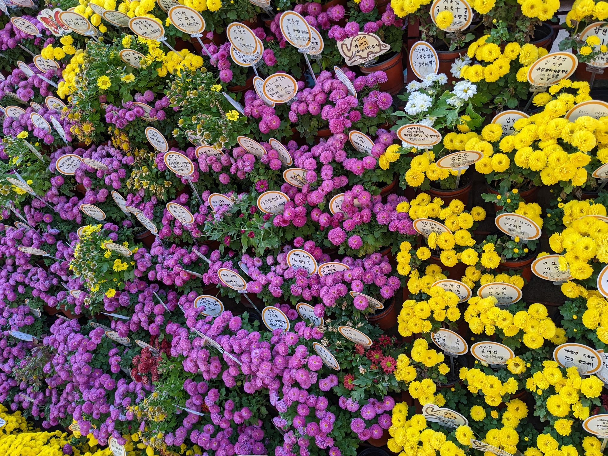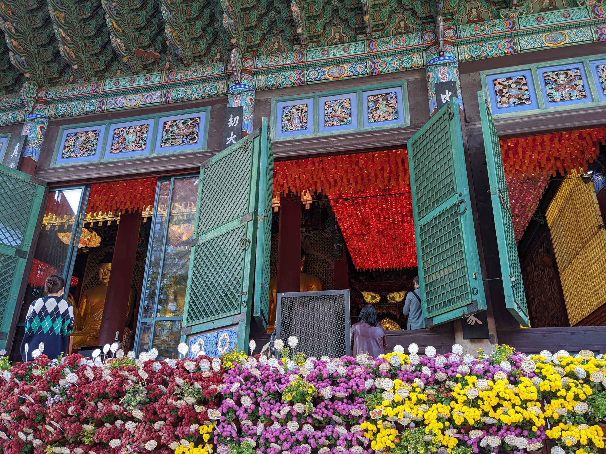 Around the base of the temple, Koreans place flowers accompanied by prayers for health, wealth and happiness. We didn't go inside the temple, but we could see the red letters (?) hanging from the ceiling inside.