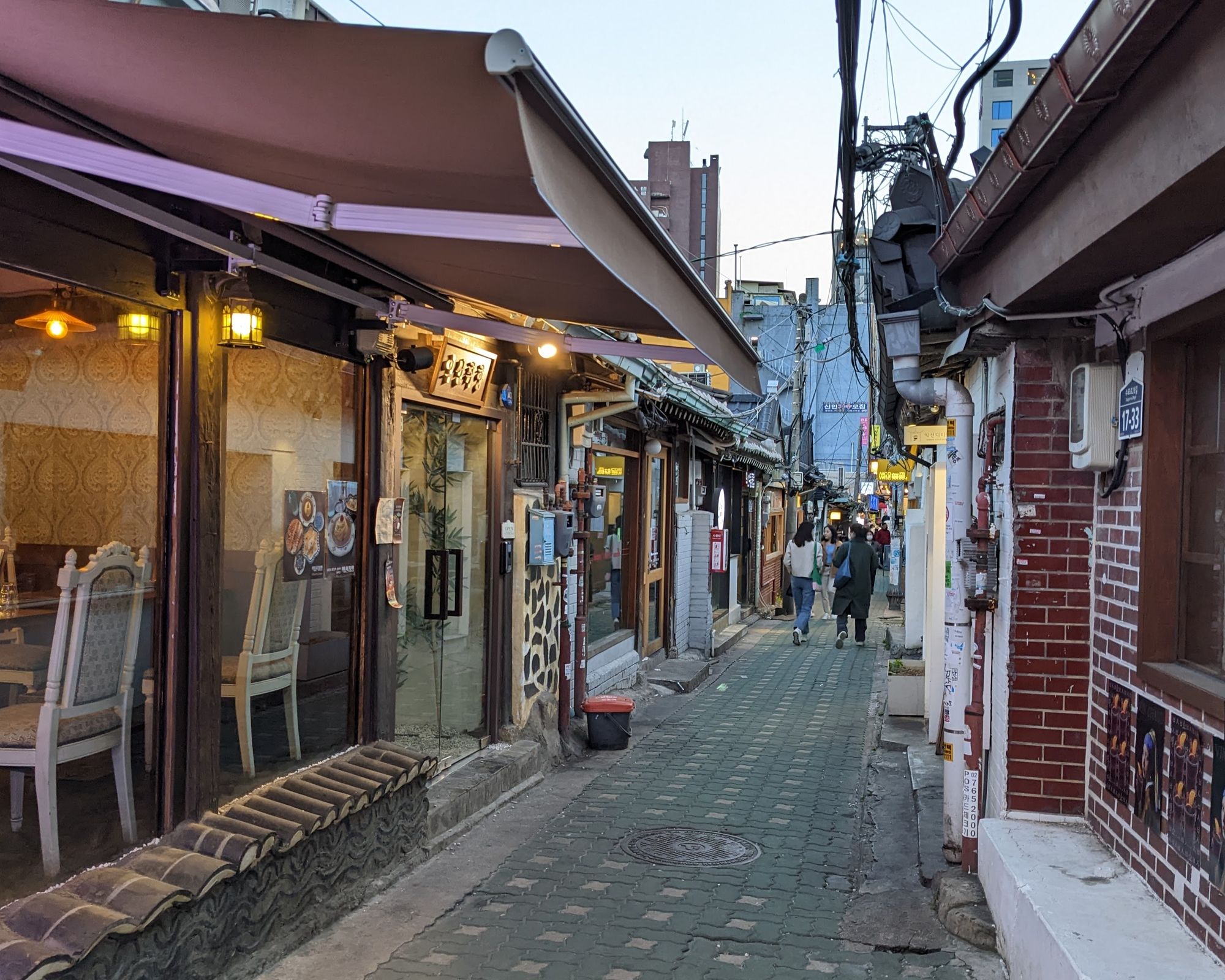 We cut through the Fitzroy of Seoul (by my estimation), a traditional hanok village now since modernized and made into the setting of many fine K-dramas. Every style of world cuisine was served here with a Korean twist. The tiny buildings had expanded by removing the interior dividers and erecting glass around the exterior as the new boundary wall.