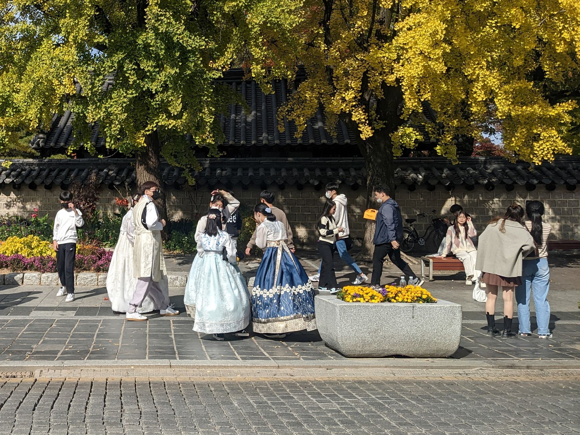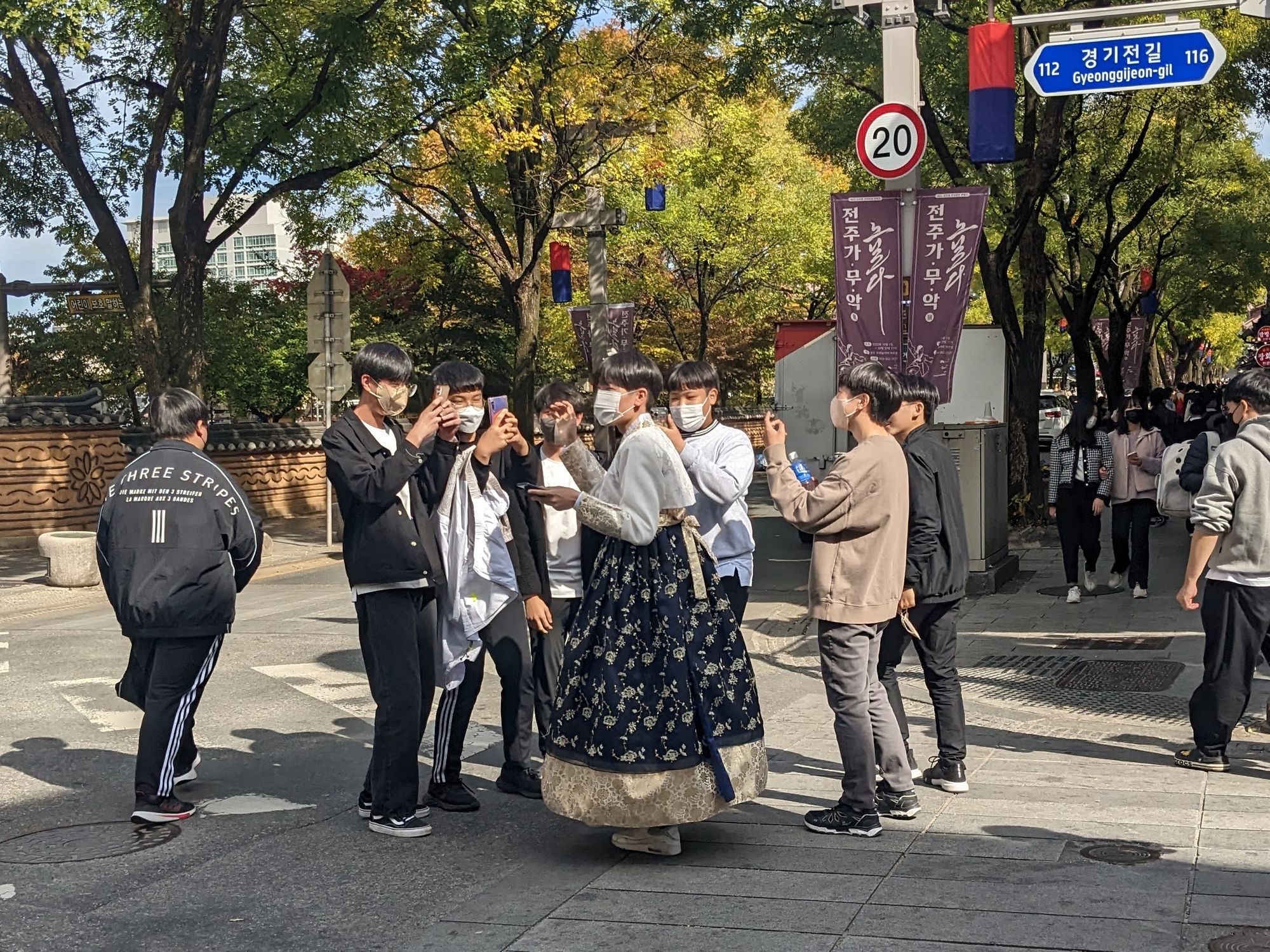 There were throngs of kids in traditional clothes around the hanok village. I suspect there was a school trip that day they all got dressed up for. Then again, secondary school students must wear uniforms in Korea, so either they were primary school kids or this was a non-school outing (on a Wednesday).
