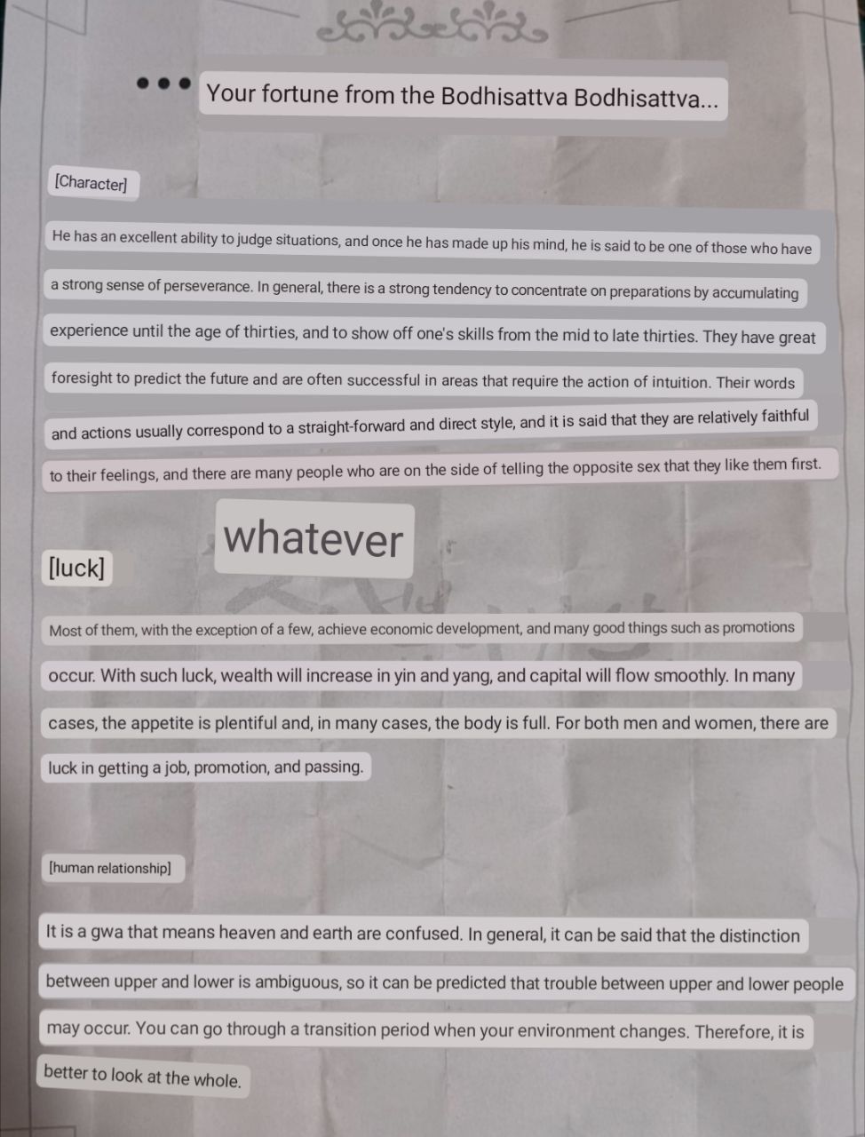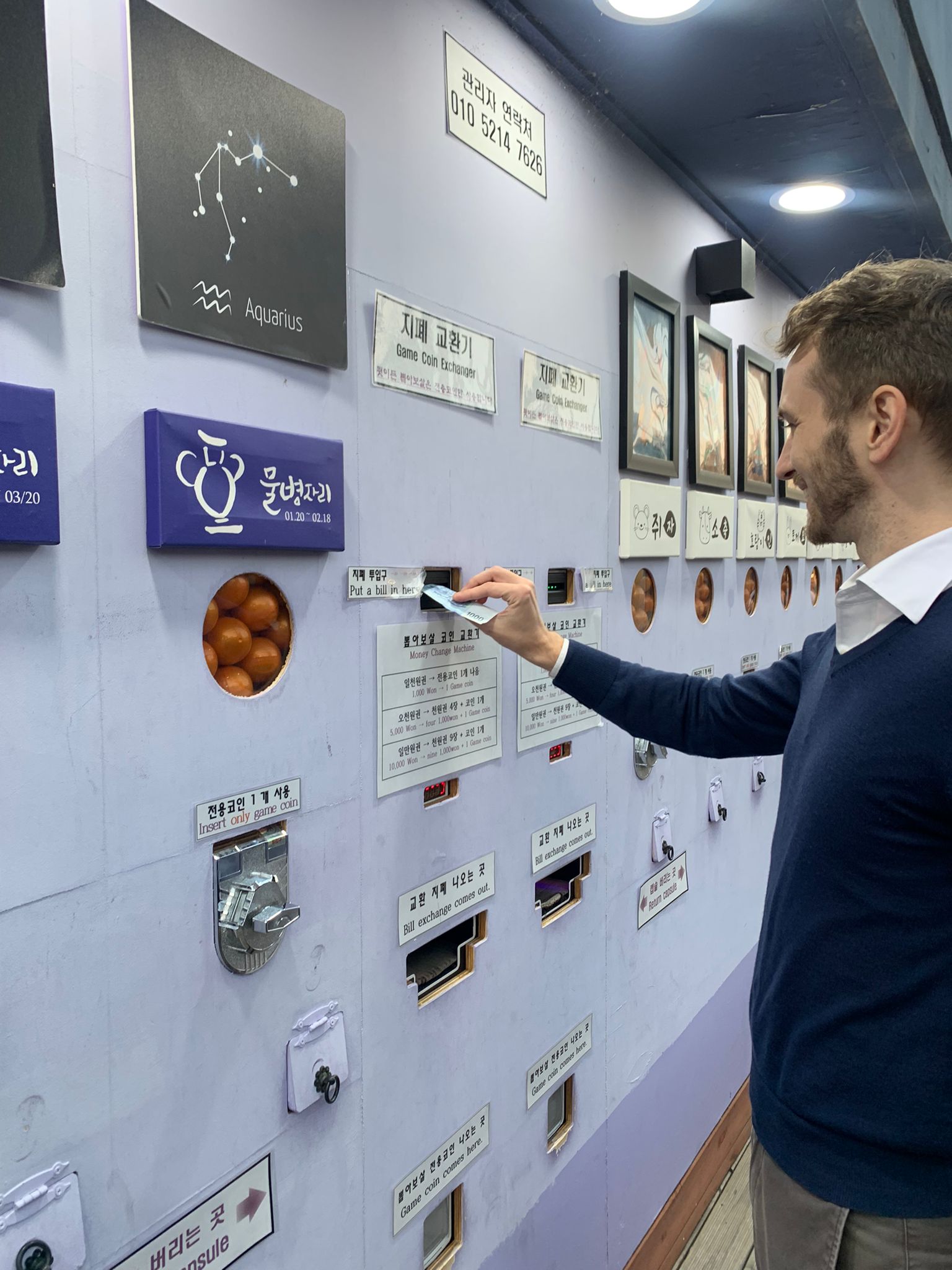 One the edge of Ikseondong was a fortune telling egg dispenser. I put in some coins, selected my zodiac sign and received a plastic egg with a fortune reading / personality assessment. I cracked open the egg with the rubber mallet provided and learnt much about myself.